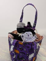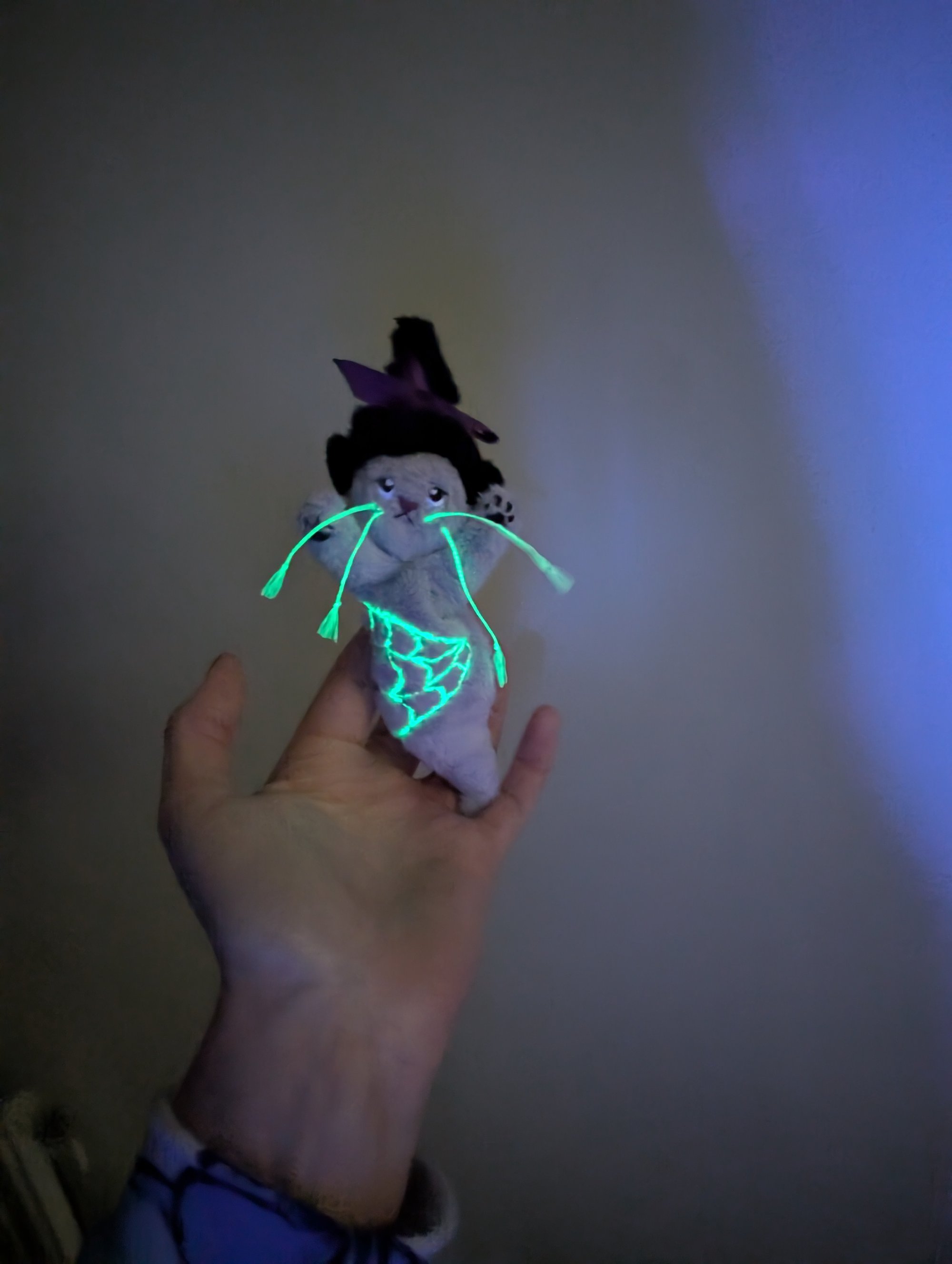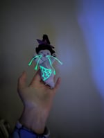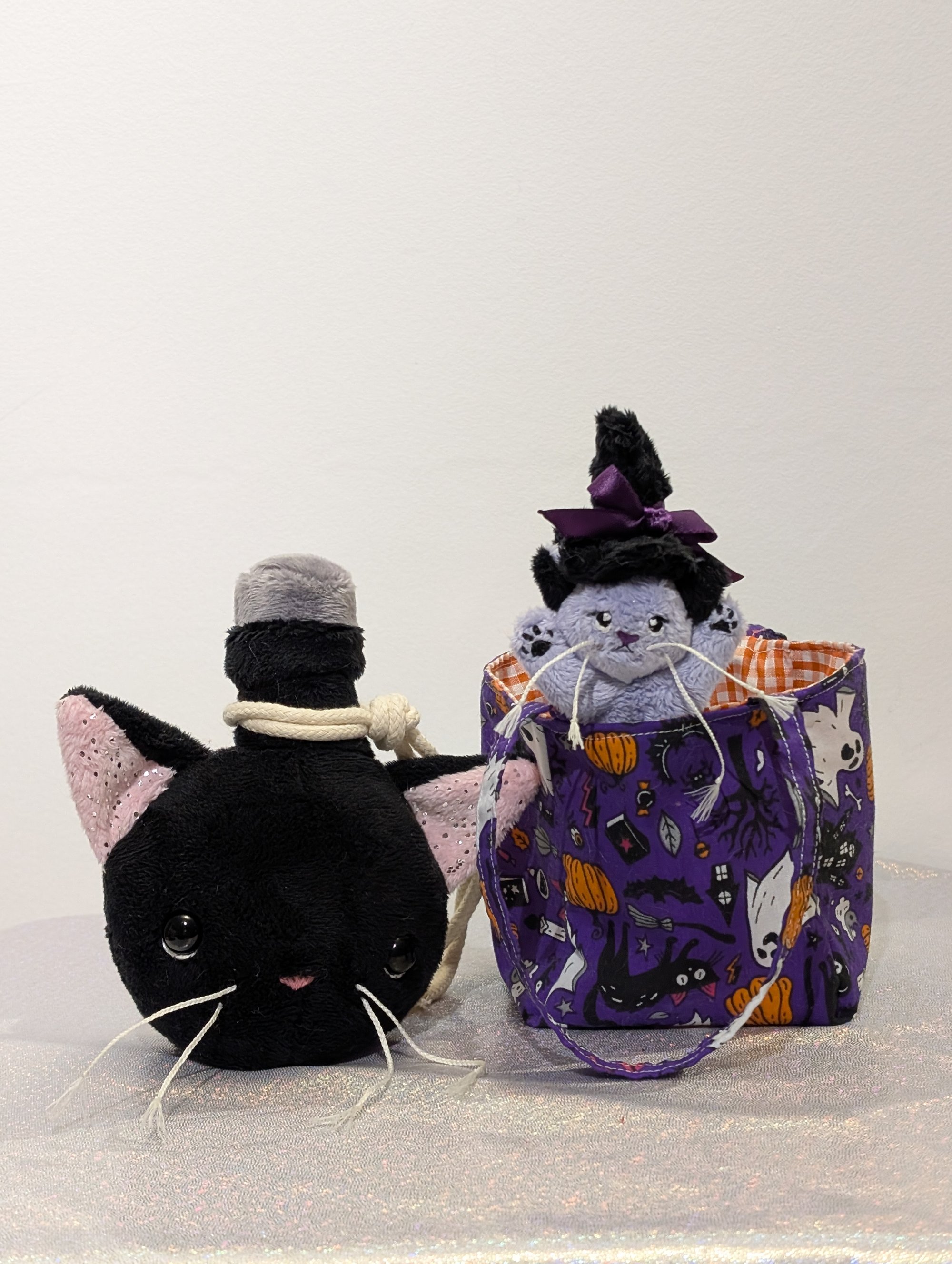 This set comes with handmade bag, tiny cat ghost with witch hat and hand embroidered spider web detailing and black cat potion bottle. Glow in the dark details show up best under a blacklight.